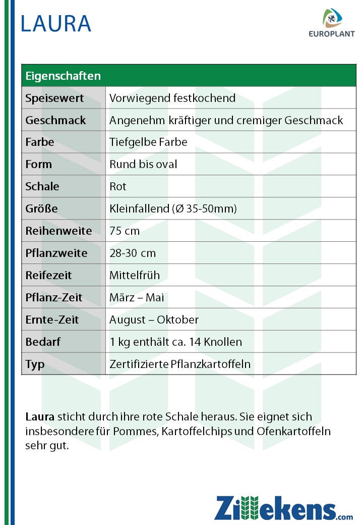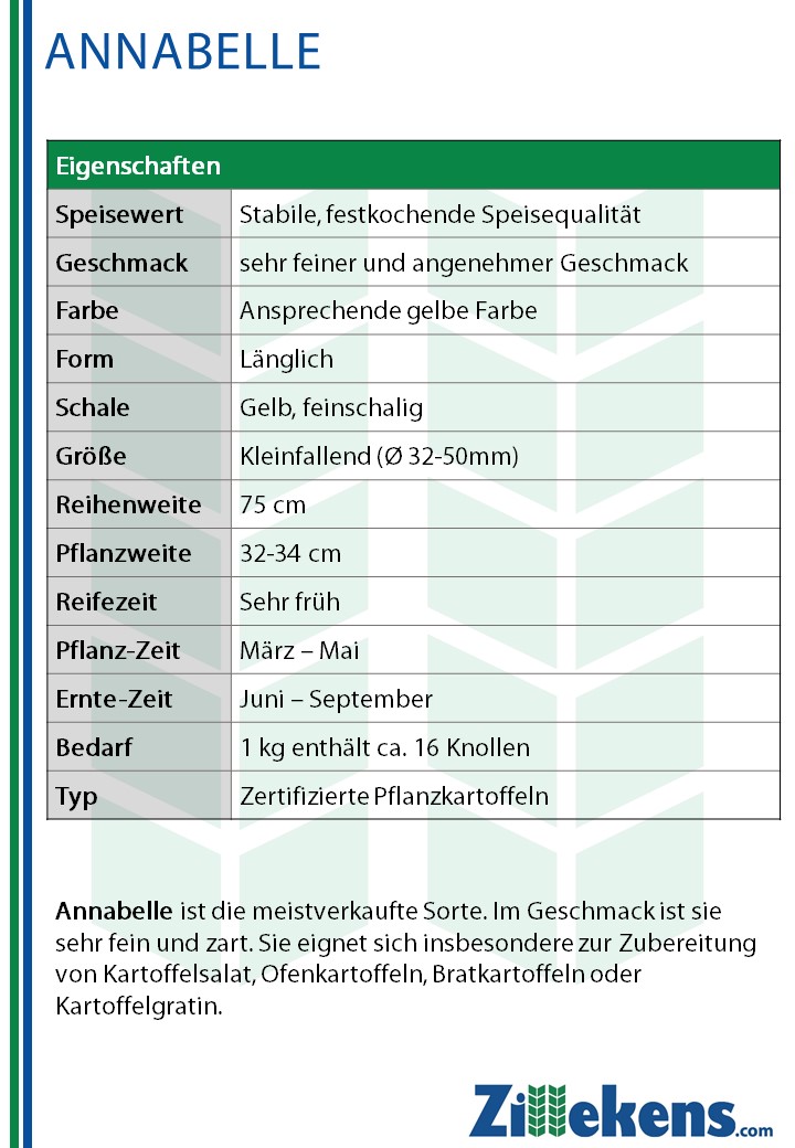 • Sonstiges: gut lagerfähig, lange Keimruhe, Salatkartoffel